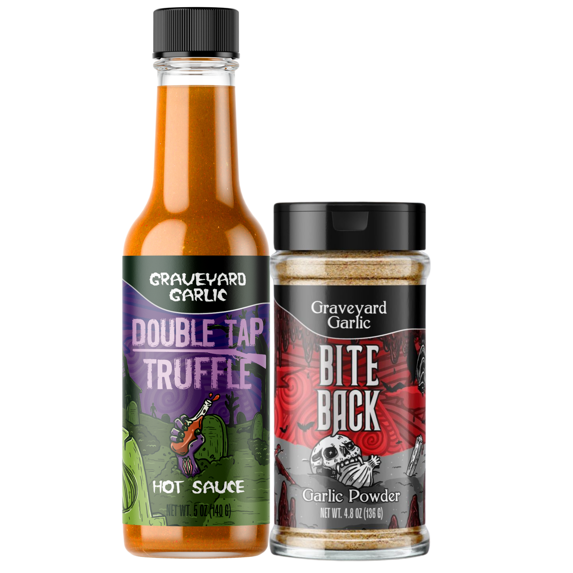 This ruthless combo includes Bite Back Garlic Powder, a bold garlicky kick that's not afraid to bite back. And Double Tap Truffle Hot Sauce, a dangerously addictive sauce with a deadly balance of heat and rich truffle garlic flavor. Perfect for grilling, spicing up your favorite dishes, or going full throttle on your culinary adventures, this duo is your ticket to a fiery showdown in the kitchen. No survivors. No mercy. Just heat.
