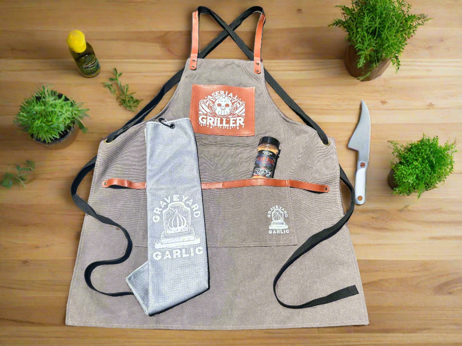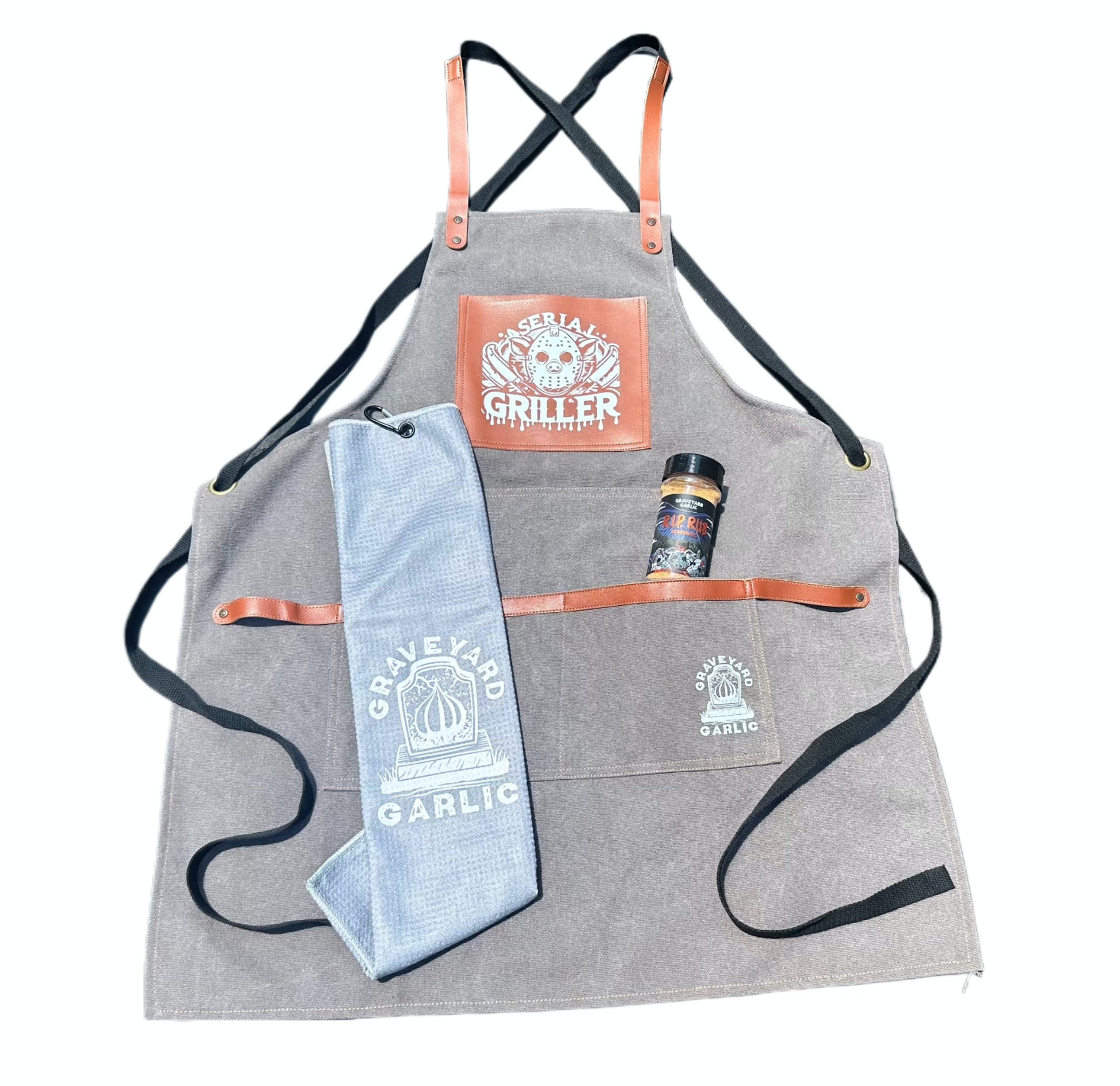 - Serial Griller BBQ Apron: Apron up for a grilling thriller! This canvas apron boasts a haunting custom design, and with adjustable straps, and oversized pockets, you'll be armed and ready for any BBQ battle!